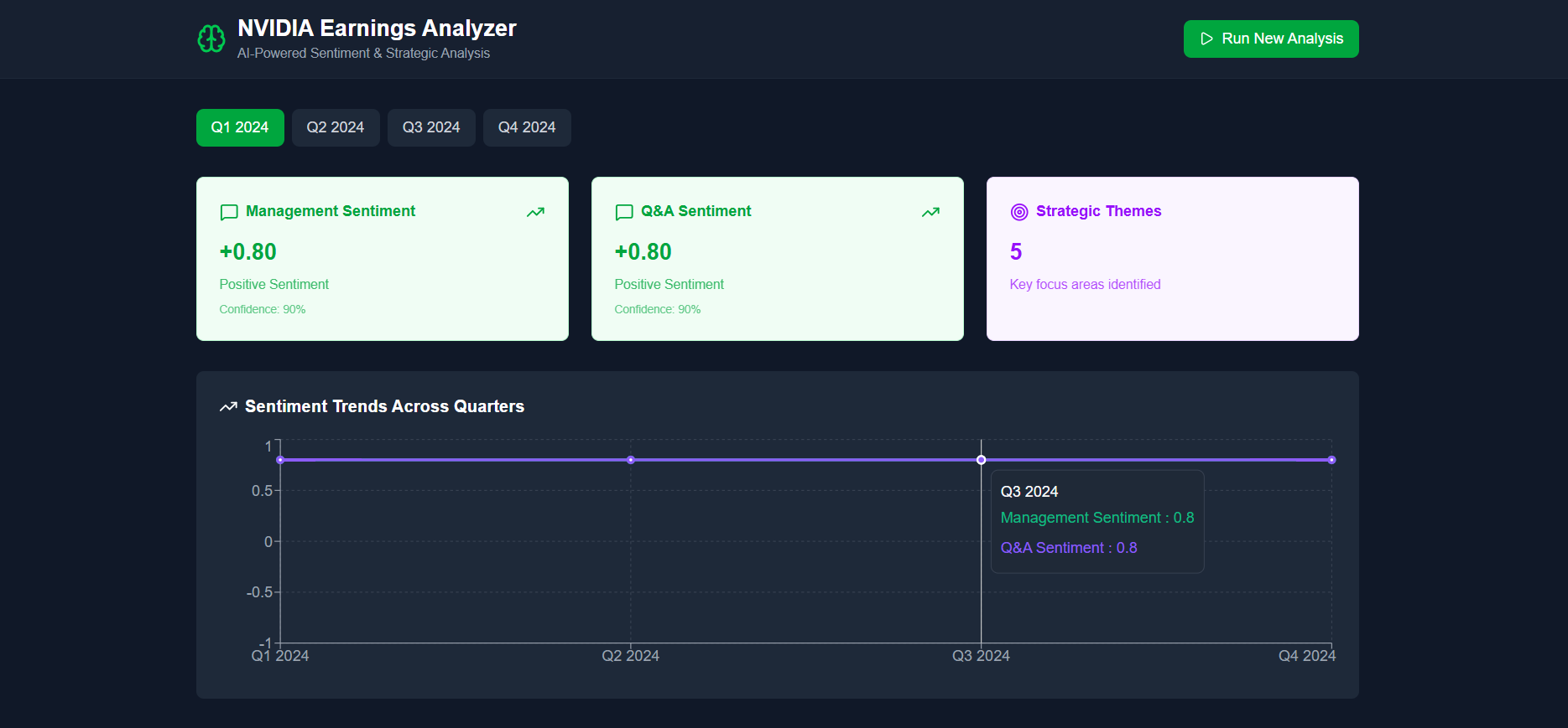 I built an AI-powered application that automatically processes four quarters of NVIDIA earnings transcripts to extract sentiment trends and strategic themes, reducing analysis time from hours to minutes.