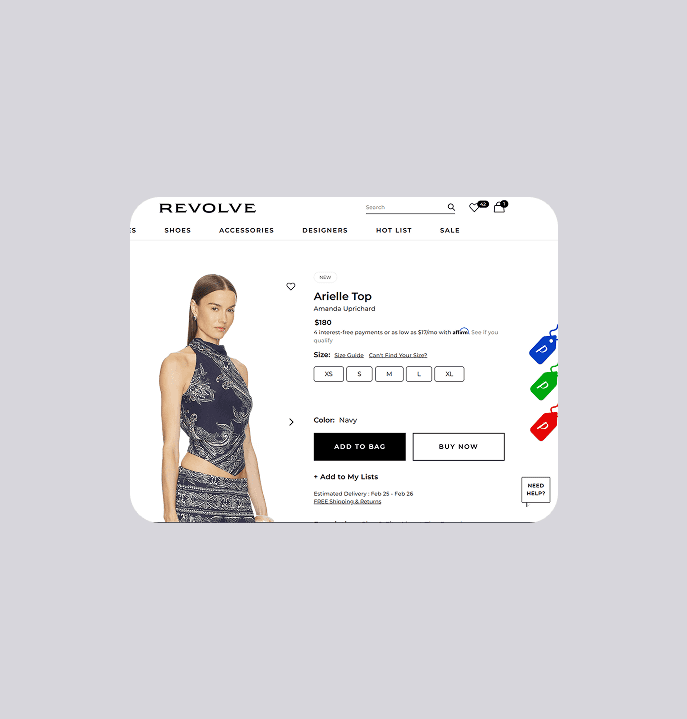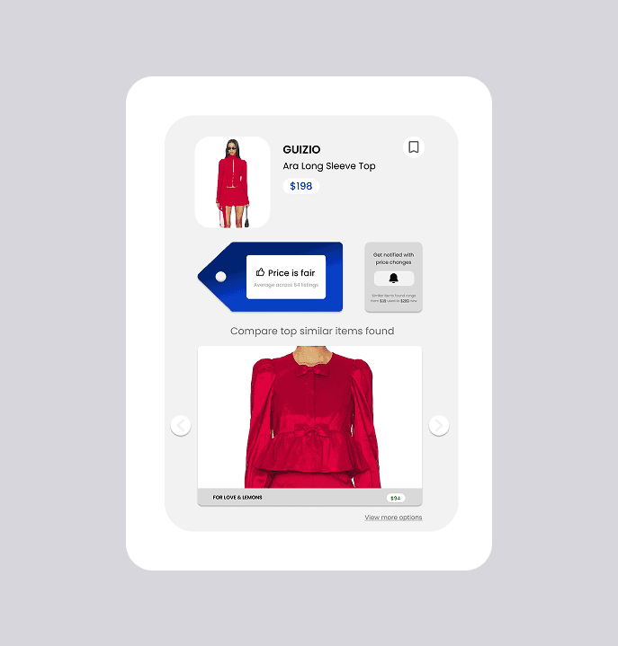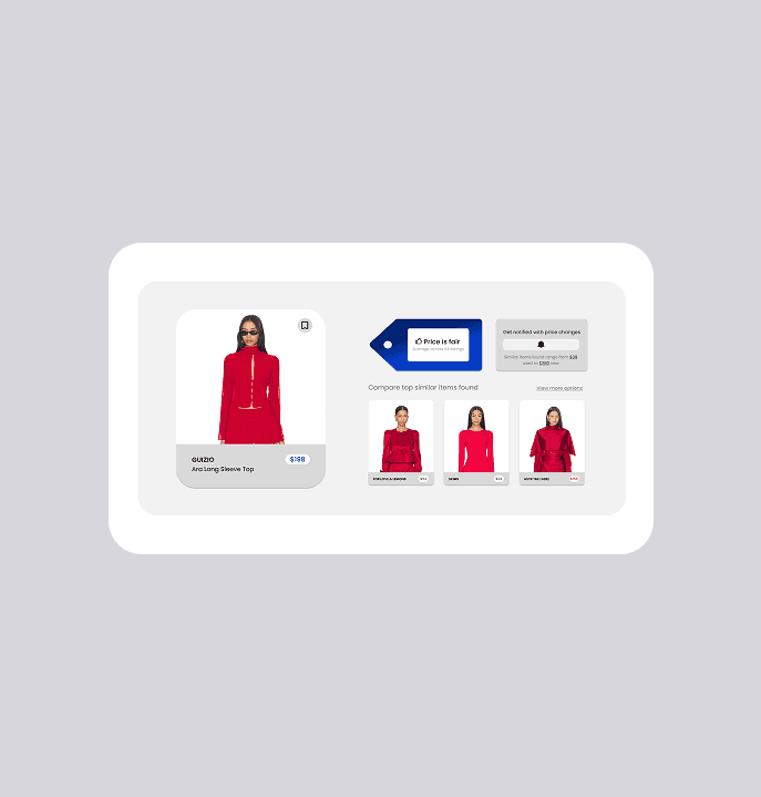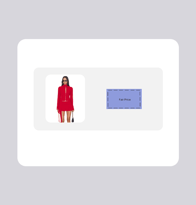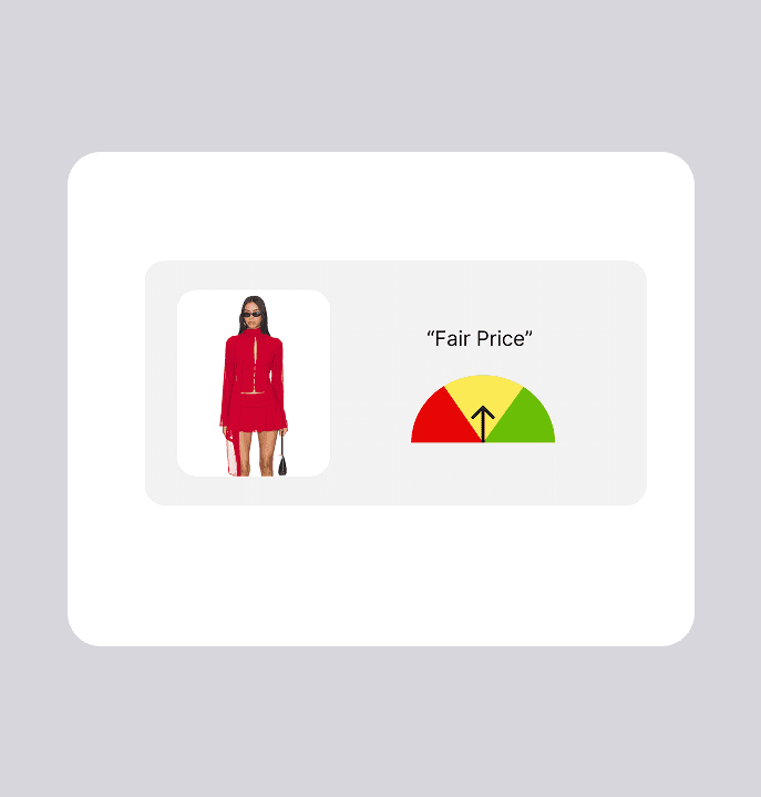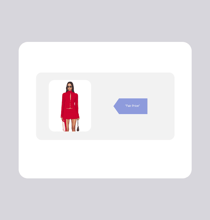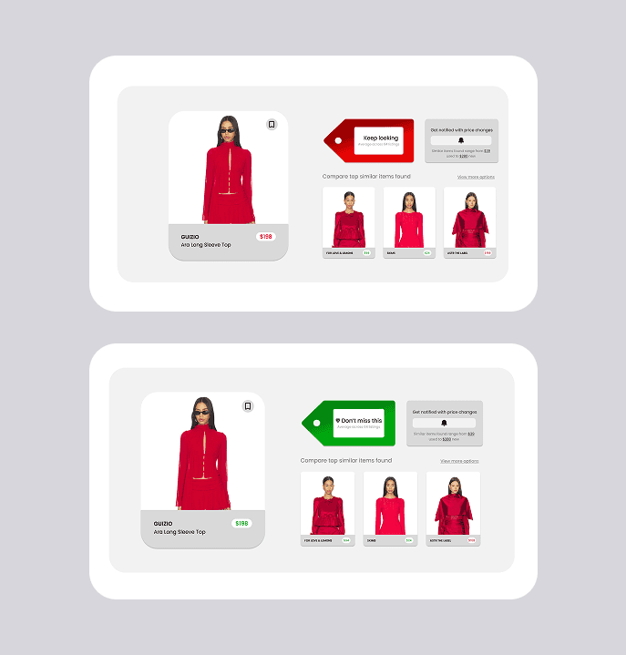 Labels like "high/typical/fair" are borrowed from finance and travel tools, not how fashion shoppers think or talk. I explored three component directions — a meter gauge, a stitched fabric label, and a pointed clothing tag — and landed on the tag. It was the most legible at small sizes, scaled cleanly across the extension and collapsed browser view, and signals fashion context through shape alone. I paired it with action-oriented language: "Don't Miss This," "Price is Fair," and "Keep Looking." I also redesigned the toolbar icon to change color based on the price verdict, giving users a passive signal before they even open the extension.